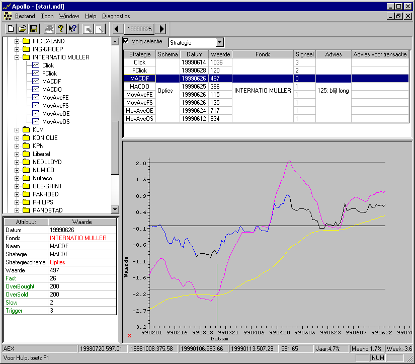 - Rechtsboven: De adviezen van alle strategieën op een rijtje, inclusief een totaal-advies (in dit geval: blijf long)