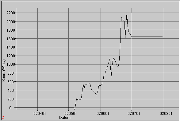 Een voorbeeld met de koers van V/D MOOLEN van 08-03-2002 t/m 30-07-2002, waarbij de koers vergeleken wordt met de AEX.