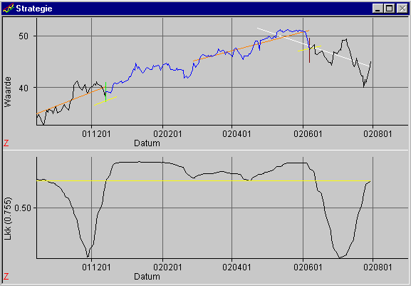 koers, waarop het koopsignaal gebaseerd is. De gele lijn daaronder geeft de deviation aan, d.w.z. de maximum afwijking die de koers t.o.v. de rechte lijn mag