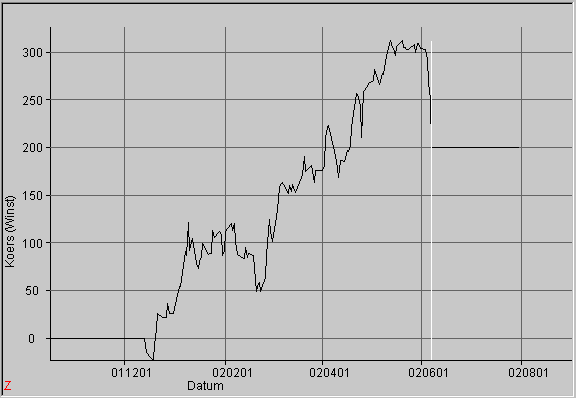 Een voorbeeld met de koers van DSM van 15-10-2001 t/m 30-07-2002.
