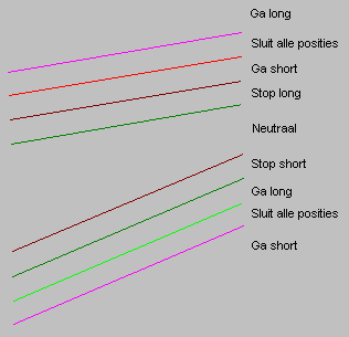 Rondom beide lijnen zijn bepaalde gebieden waarvoor koop- en verkoopmomenten gelden. Als de koerslijn in zo’n gebied komt, volgt een koop- of verkoopadvies. De grootte van deze gebieden wordt bepaald door parameters. De rode lijn is de beste lijn door de toppen en is de weerstandslijn. De groene lijn is de beste lijn door de dalen en is de steunlijn. De overige lijnen markeren de gebieden met adviezen.