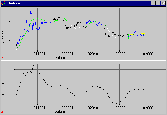 In de onderste grafiek zien we de TSF richtingswaarde, die negatief begint ten
