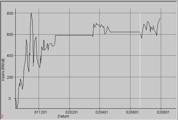 Een voorbeeld met de koers van KPN van 15-10-2001 t/m 30-07-2002.